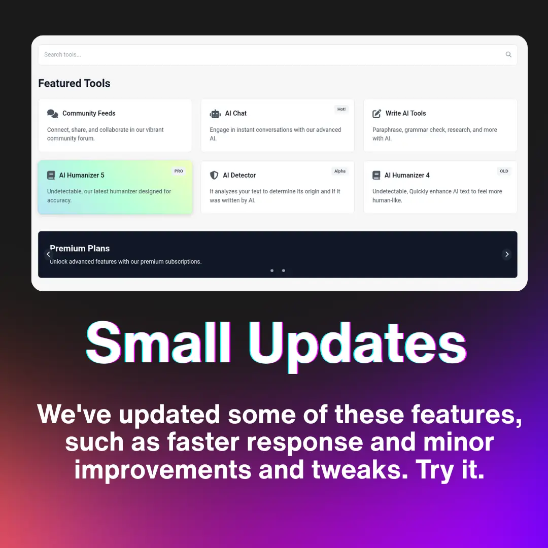π 5 UPDATES! 1. You can now upload a profile picture 2. We've added a "gift card" function. 3. We've revamped the header design, and other tools. 4. We've fix the issues related to auto log out for mobile phone users 5. We've updated the Humanizer 2 due to gibberish output